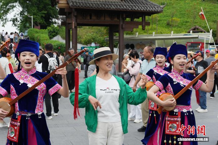 图为演出职员身脱平易近族打扮款待搭客。李源 摄